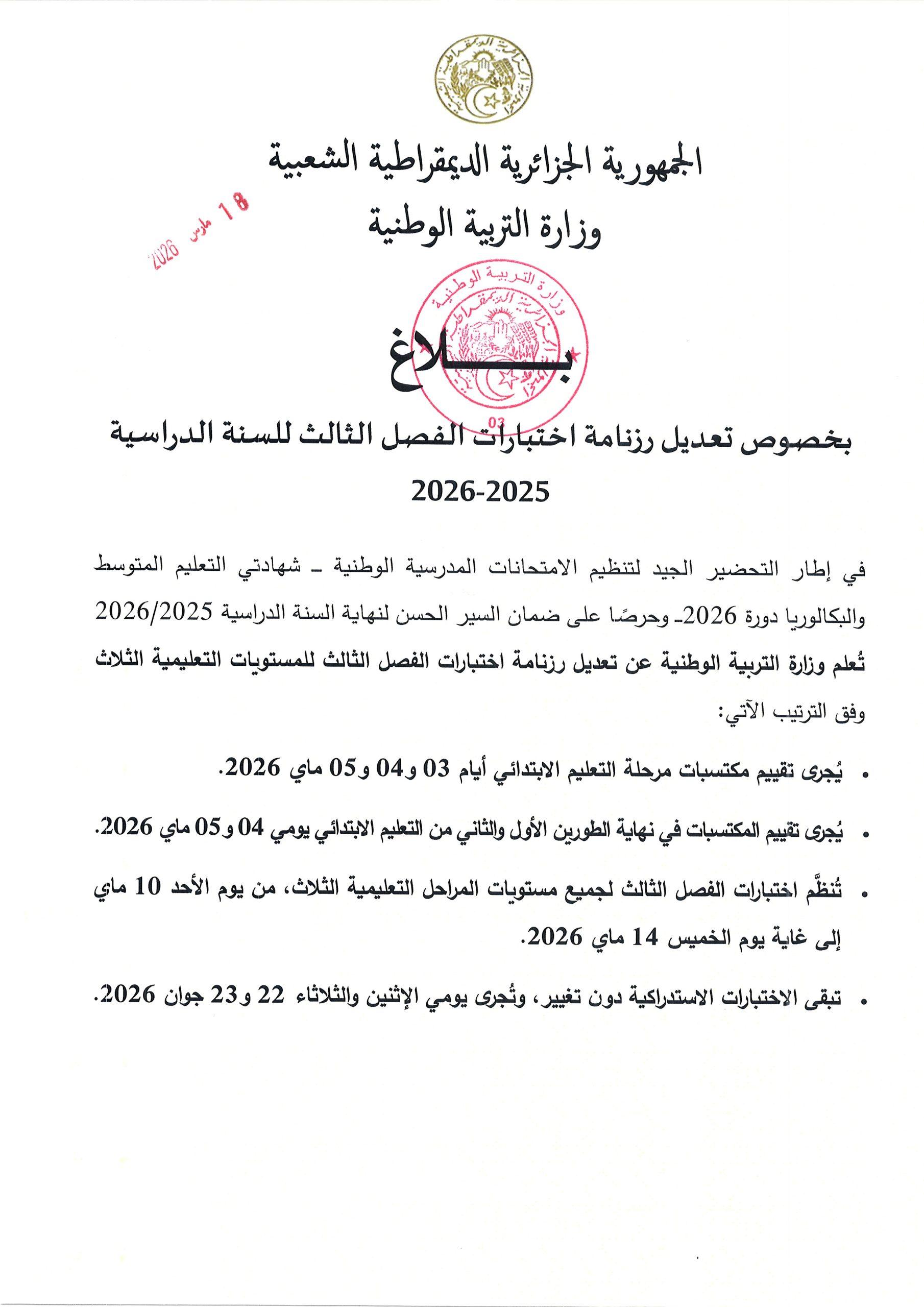 بلاغ بخصوص تعديل رزنامة اختبارات الفصل الثالث للسنة الدراسية 2025-2026